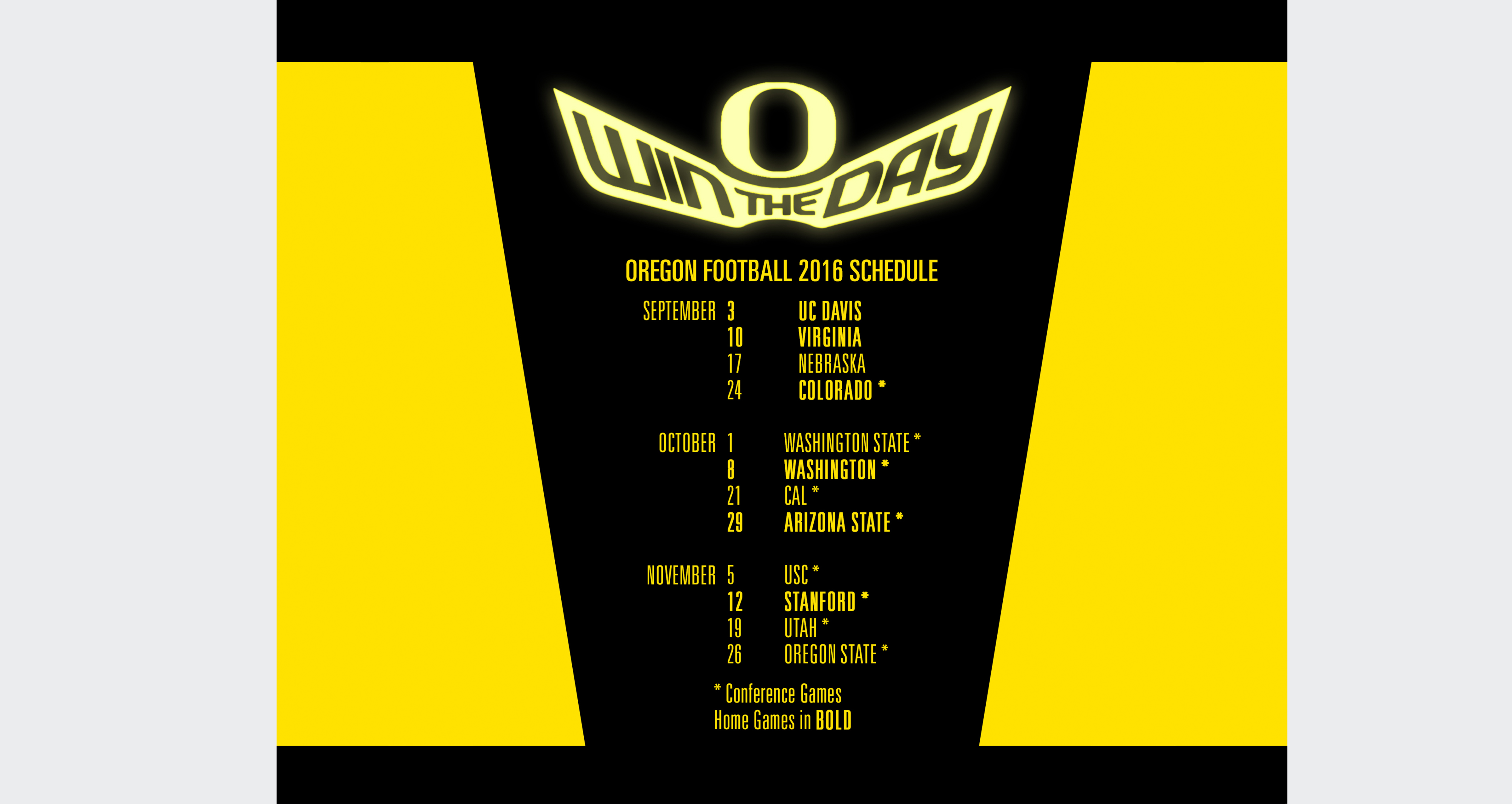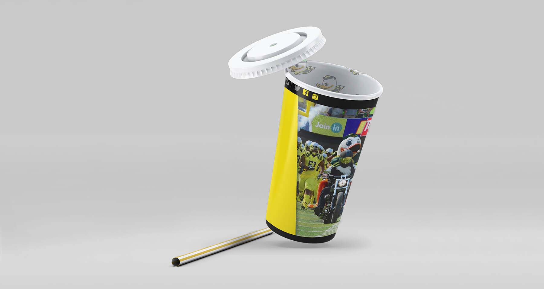 In preparation of the 2016-17 Football Season, I was asked to design the new season memorabilia cup to be handed out at all major sporting events. I chose make the main image a familiar shot of the game-opener, where the Duck mascot rides a Harley onto the field. The cup featured the 2016-17 football scheduel on the back and an inner lining of the Fighting Duck logo. The cup was handed out to thousands of fans throughout the year. One of my favorite projects!
